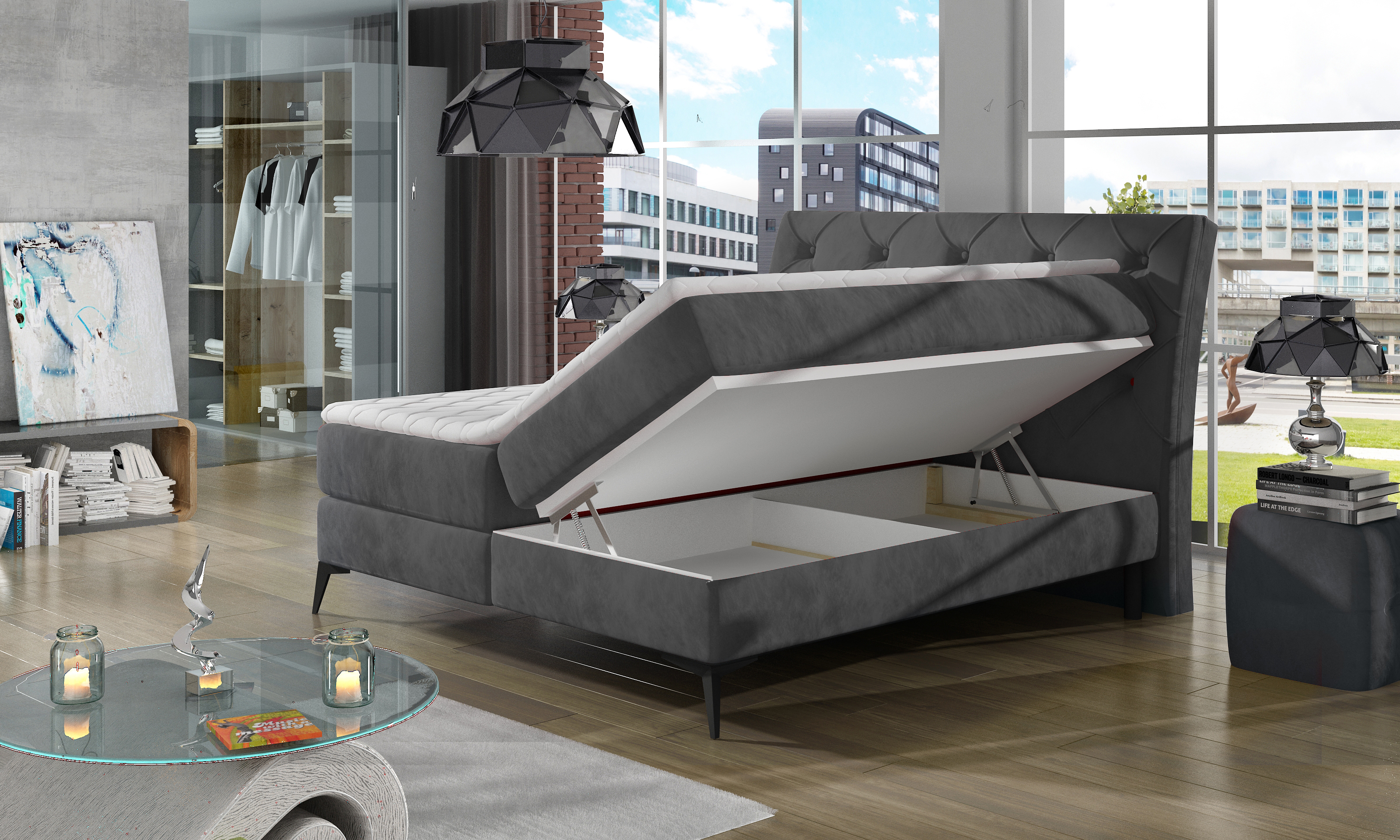 • Stylish and comfortable PROMO bed from the Boxspring collection will add chic to any of your interiors and give maximum comfort during sleep or relaxation. It has an elegant design and concise form. Capacious boxes for linen provide convenient storage of bedding and other items. A wide selection of upholstery and color options is available.