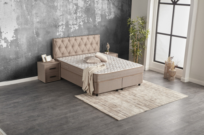 Ergo Comfort 2 bed with lifting mechanism, laundry box and withotmattress. Luxurious and soft headboard with tie and soft sides. Bed base on carved legs. In addition, you can order bedside tables, a pouf, a bench.