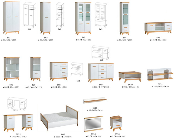 The 4MEBELES SCANDIC system is a wonderful collection in the Scandinavian style, which will give a unique atmosphere to your interior and make it cozy. The combination of simple andersen pine fronts with wood imitation accessories is the latest fashion scream in interior design and decor, both in bedrooms, youth rooms and living rooms. The legs and handles are made of natural oak wood, colored in the same color as the furniture tops. All blocks are solidly and accurately made of the highest quality materials. Furniture from the SCANDIC system not only looks great and original, they are also extremely roomy and functional, which is a huge advantage in everyday use.