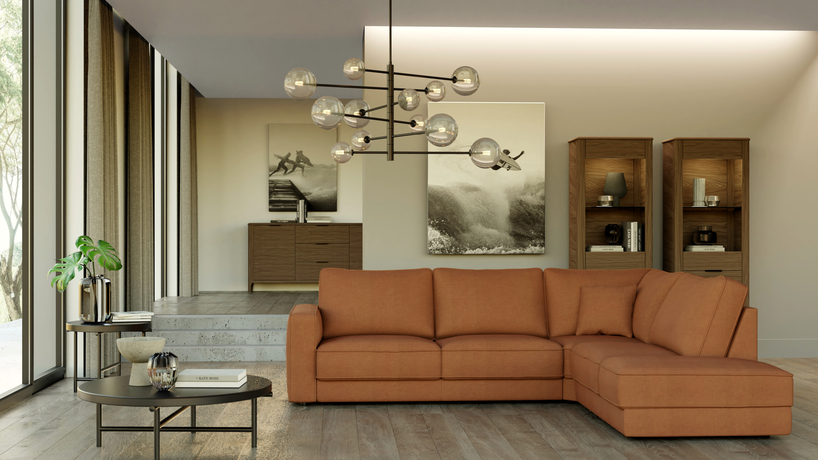 The Alexandria modular collection features comfortable filling with an additional pocket spring insert, providing enhanced comfort. It includes a sleeping function, storage for bedding, and an electric relaxation feature. A unique module in this collection offers a pull-out drawer and a USB port, available in natural leather or fabric. Its simple and timeless design makes it suitable for both modern and classic interiors.
