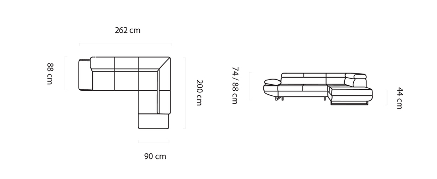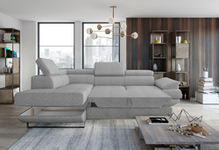 The Gio corner sofa is a compact, comfortable, and functional solution for smaller living rooms. With its sleep function, it provides comfortable rest both during the day and at night. The hidden storage compartment in the ottoman is perfect for extra bedding, helping to maintain order in the room. The sofa is placed on black metal rails, giving it a modern look. Gio combines functionality with elegance, making it an excellent choice for contemporary interiors. It features a sleep function with additional support (dolphin type), a storage compartment for bedding, a relax function for the headrests and armrests, zigzag springs, and stylish metal legs. Available in both right and left corner versions.