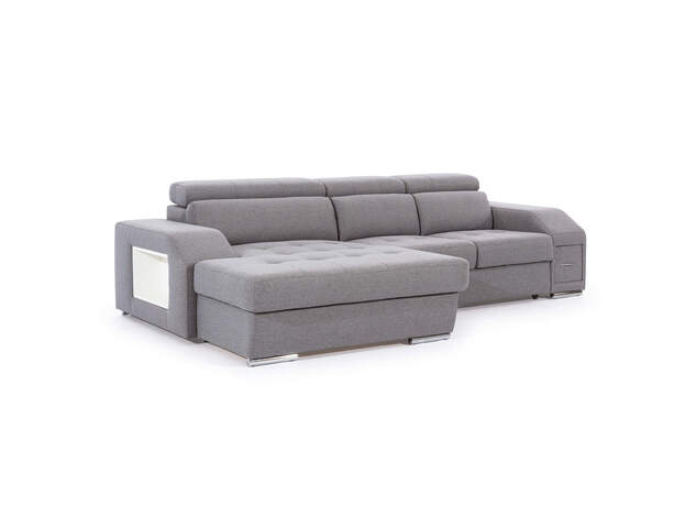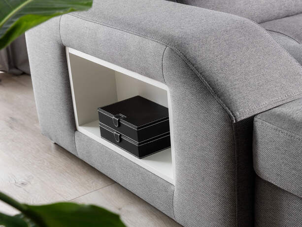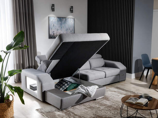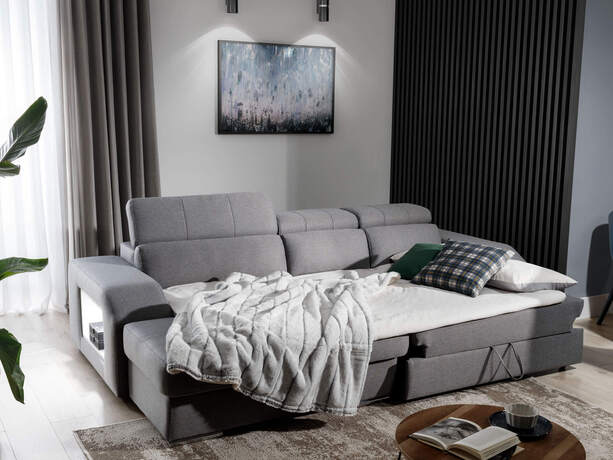 • It features adjustable headrests, a sleeping function, a bedding storage compartment, an illuminated shelf, and an additional storage space in the side section.