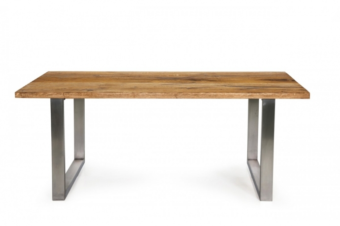 • The Elisse table will inspire you to create a modern dining room arrangement. The design of the frame attracts attention, in 4 color variants to choose from. The legs of the table for the living room are made of steel coated with a varnish of a color (natural, white, black, smooth graphite). Powder coating means that the elements painted with this method are not susceptible to corrosion and mechanical damage, it ensures a long durability of the paint. Cracked oak veneer top is resistant to high temperatures, scratches, and is also easy to keep clean. The combination of a wooden table top with steel legs is a great combination in an industrial style. An interestingly constructed base will add character and original design to our interior.