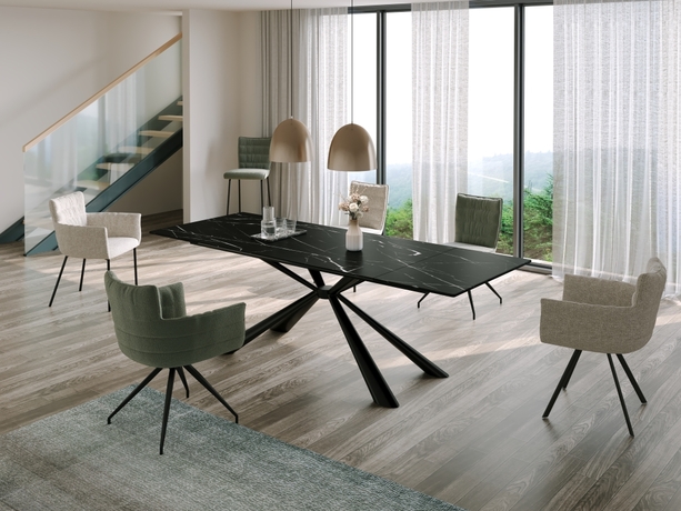STAY galds apvieno stilīgu dizainu un praktiskumu. Galda virsma no 11 mm  keramikas “Shakespeare Black” ar melnu‑sudraba toni ir izturīga pret skrāpējumiem un viegli tīrāma. Ar diviem pagarinājumiem galds ātri paplašināms, nodrošinot vairāk vietas viesiem. Metāla rāmis ar raupju melnu pulverkrāsojumu piešķir stabilitāti un modernu izskatu. Specifikācija: