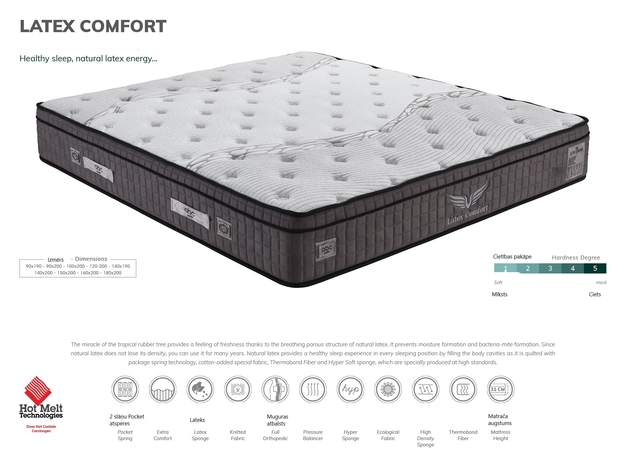 Dabīgais latekss nodrošina veselīgu miegu katrā gulēšanas stāvoklī, aizpildot ķermeņa dobumus, jo tas ir stepēts ariepakojuma atsperu tehnoloģija, kokvilnas pievienots īpašs audums, Thermobond Fiber un Hyper Soft sūklis, kas ir īpaši ražoti pēc augstiem standartiem.
