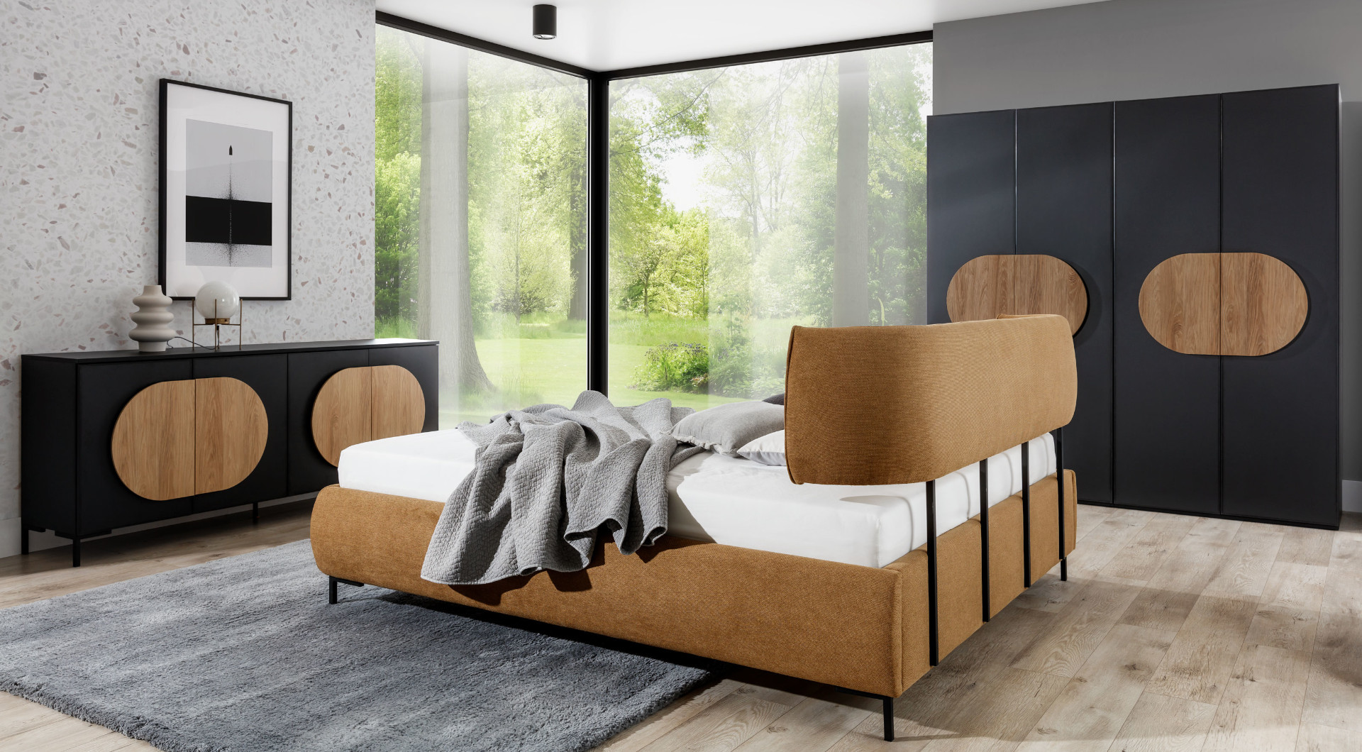 • Oriģināls itāļu stila guļamistabas komplekts, kas izgatavots no eleganta, melna, matēta mēbeļu plātnes ar SD struktūru no Pfleiderer kolekcijas un lieliem dekoratīviem elementiem ovāla formā, kas izgatavota no ozola hikorija dēļa ar skaistu koka rakstu. Atkārtots ovālu un apaļu ornamentu motīvs uz skapjiem, kumodēm un naktsgaldiņiem. Gulta ar noapaļotu dizaina galvgali, kas apdarināta ar ovāliem elementiem ar dekoratīvu apdari. Gultas augstums regulējams trīs augstumos. Pieskaņots sols un tualetes galdiņš uz metāla pamatnēm ar noapaļotām formām.