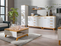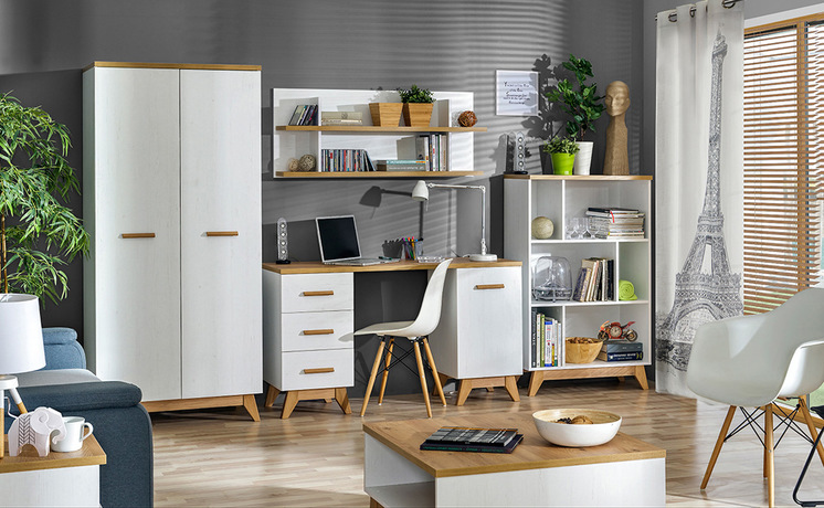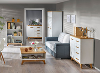 • 4MEBELES SCANDIC sistēma ir brīnišķīga kolekcija skandināvu stilā, kas jūsu interjeram piešķirs unikālu atmosfēru un padarīs to mājīgu. Vienkāršs PINE ANDRERSEN Fasades raksts kombinācija ar OAK NASH ir jaunākais modes kliedziens interjera dizainā un dekorā gan guļamistabās, gan jauniešu istabās, gan viesistabās. Kājas un rokturi ir izgatavoti no dabīga ozola koka, krāsoti tādā pašā krāsā kā mēbeļu pamatne. Visi elementi ir stingri un precīzi izgatavoti no augstākās kvalitātes materiāliem. Mēbeles no SCANDIC sistēmas ne tikai izskatās lieliski un oriģināli, bet arī ir ļoti ietilpīgas un funkcionālas, kas ir milzīga priekšrocība ikdienas lietošanā.