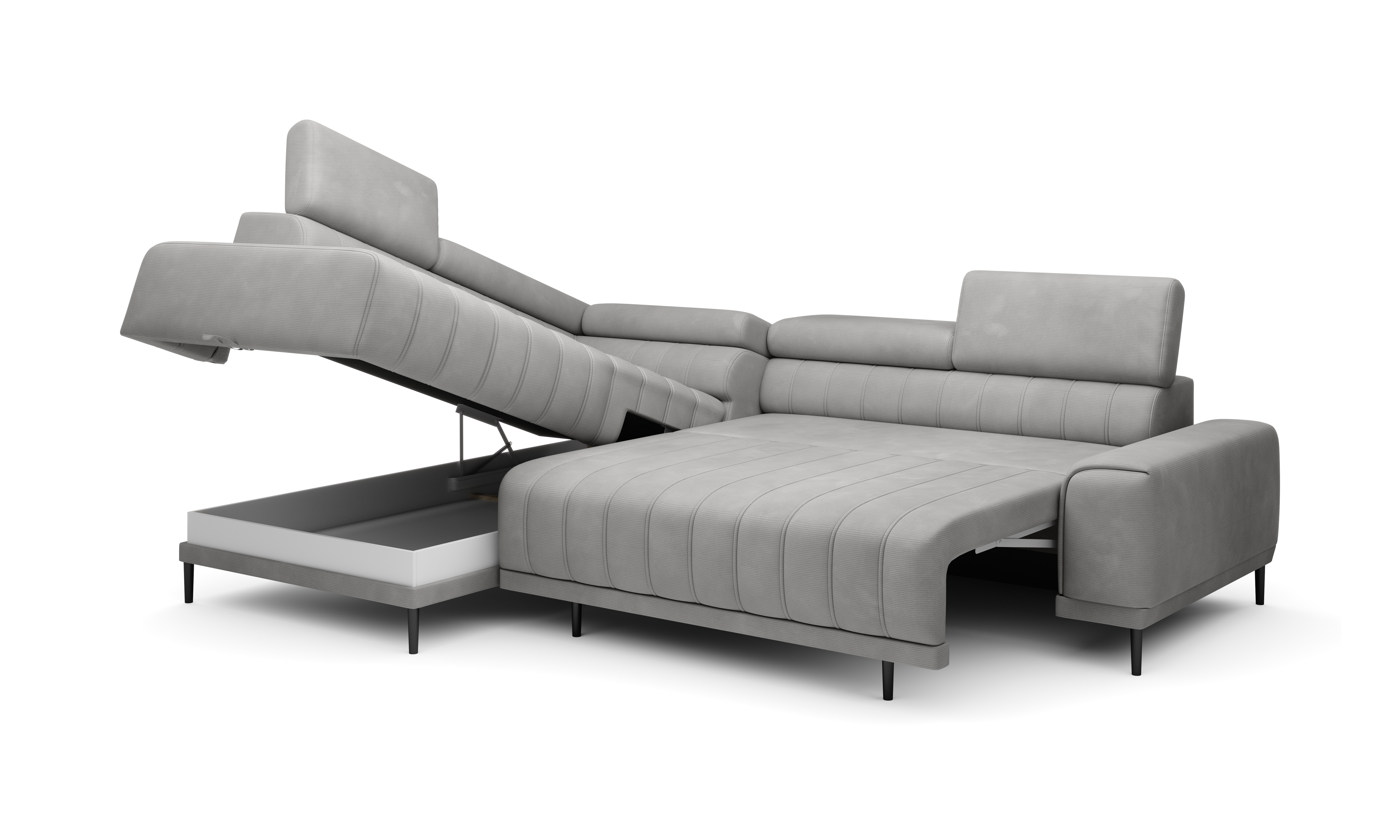 CALDO - stūra dīvānu izceļ ar vertikālu līniju. Pielāgojami galvas balsti ļauj konfigurēt pārējo lietotāja individuālās vajadzības. Pateicoties PUMA izvēršanās sistēmai, šis stūra dīvāns faktiski pārvēršas par gultu ar guļamistabu 140 × 200 cm.