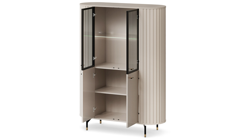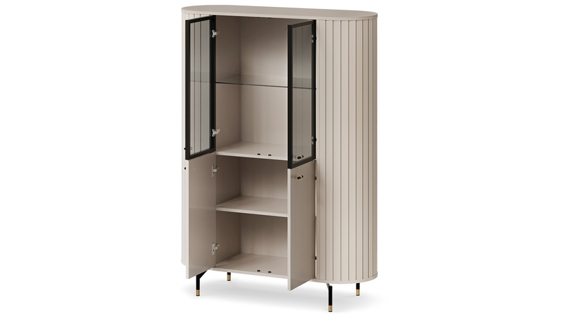 Коллекция Zante — это стильное и функциональное решение для современной гостиной или столовой. Элегантный оттенок кашемир, закругленные боковые элементы из МДФ-реек и изящные черно-золотые ножки создают легкий и утонченный образ. Система включает комоды, витрины, ТВ-тумбы и навесные элементы, которые можно свободно комбинировать между собой, создавая индивидуальный интерьер. Материалы: ламинированная ДСП 16 мм, стеклянные вставки, МДФ-декор, ПВХ-кромка.